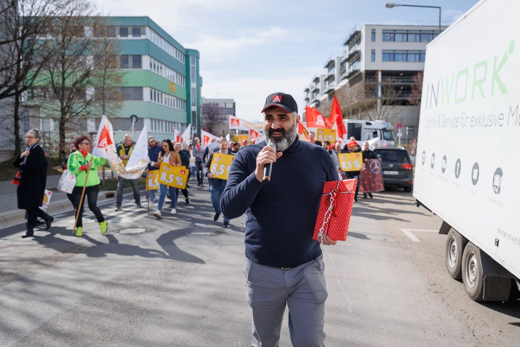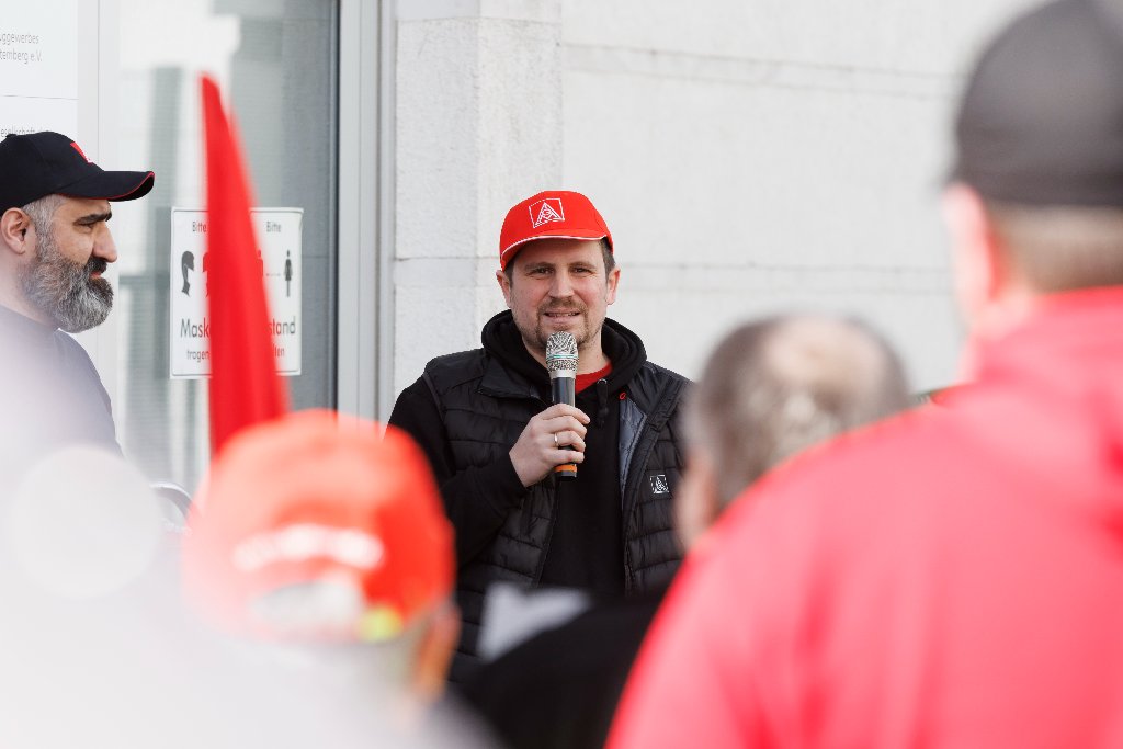 Ingo Kontny, Betriebsratsvorsitzender der Mercedes-Benz Niederlassung Stuttgart und Mitglied der Verhandlungskommission, unterstreicht die Unterstützungsbereitschaft der Belegschaft für die Forderungen der IG Metall: "Wir wollen ein großes Stück vom Kuchen haben und kein trockenes Stück Brot. Wir wollen die 8,5 Prozent. Die komplette Mannschaft steht hinter uns - wir sind bereit."