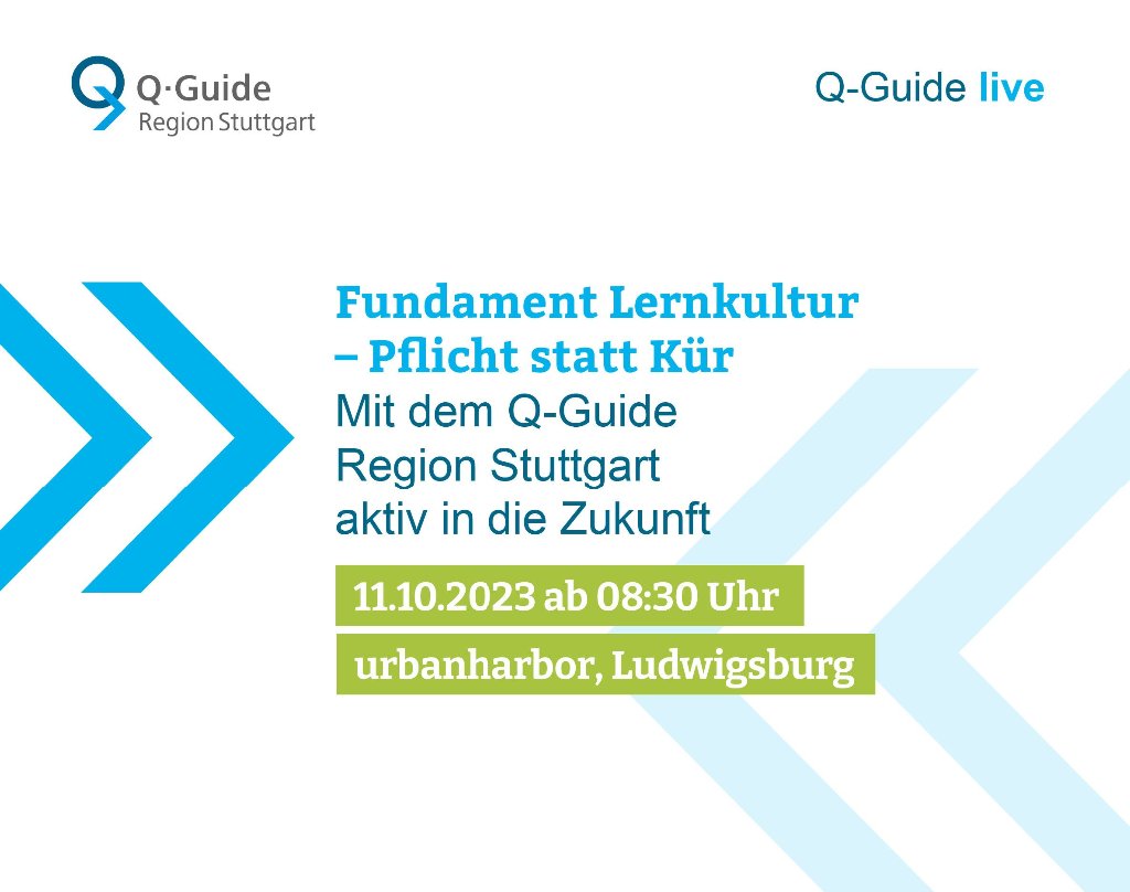 Weitere Informationen zur Reihe Q-Guide live: Die Veranstaltungsreihe ist ein Angebot der Wirtschaftsförderung Region Stuttgart GmbH in Zusammenarbeit mit den weiteren Partnerorganisationen, wie die IG Metall Region Stuttgart, des Weiterbildungsverbunds Region Stuttgart (WBV). Q-Guide live bietet kostenlose Unterstützung bei der Fachkräftesicherung durch Qualifizierung und ist ein Veranstaltungsformat gezielt für Unternehmen. Die Reihe widmet sich dem vielschichtigen Thema der Weiterbildung in seiner Gesamtheit und nimmt bei jeder Veranstaltung ein anderes Schwerpunktthema in den Fokus. Sie macht Station an sechs Terminen in den Stadt-/ Landkreisen der Region Stuttgart und unterstützt so die regionalen Transformationsprozesse.