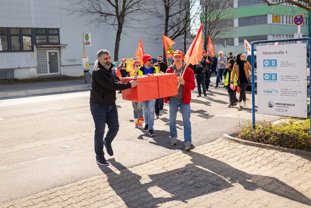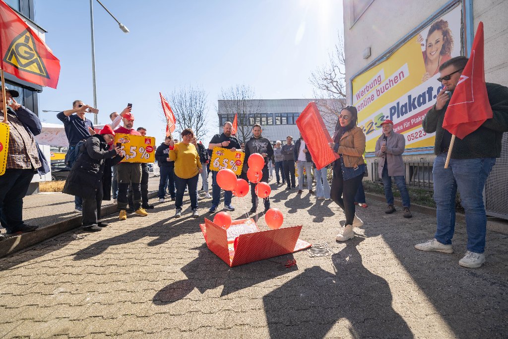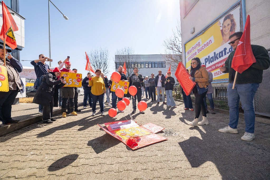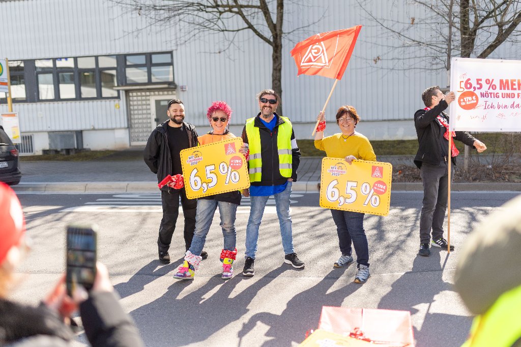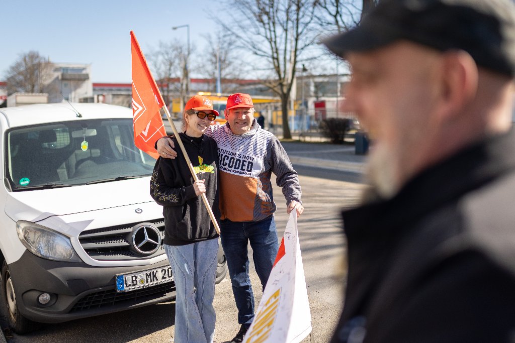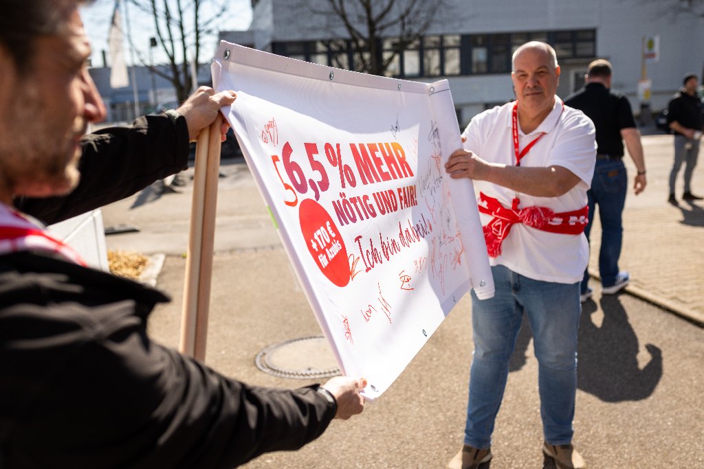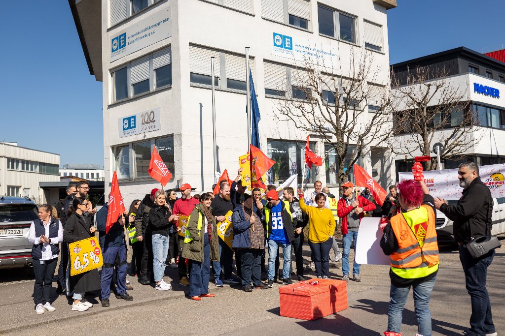 Zum Auftakt der Tarifrunde haben rund 50 Betriebsrät*innen des Kfz-Handwerks in der Region Stuttgart symbolisch die aktuelle Tarifforderung an den Arbeitgeberverband des Kraftfahrzeuggewerbes Baden-Württemberg übergeben. Im Rahmen der öffentlichen Aktion wurde ein plakatives Paket überreicht, das die Forderungen für die Tarifrunde im Kfz-Handwerk 2025 enthält.