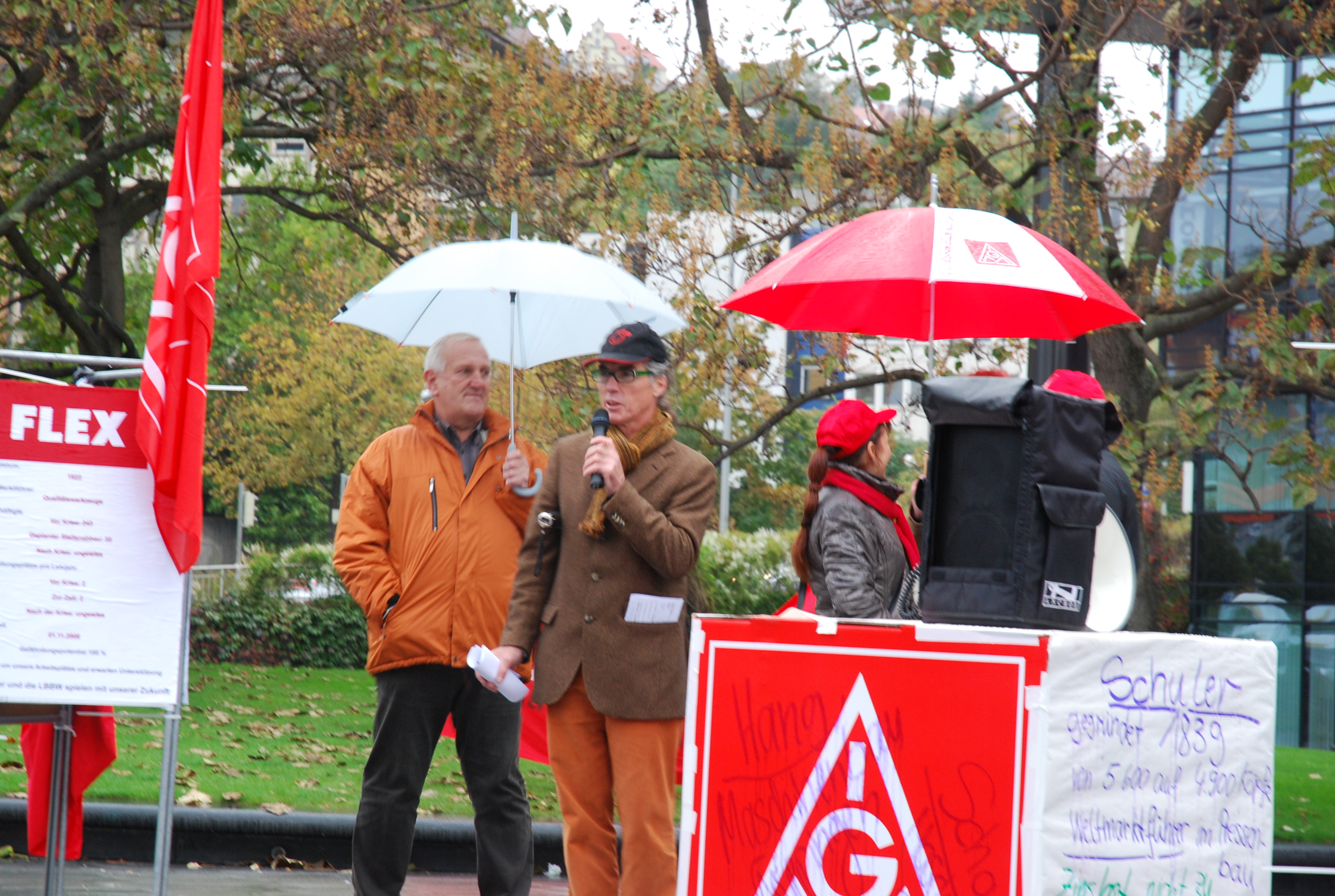 Die Betriebsratsvorsitzende von Flex und Mitglied im Ludwigsburger IG Metall Ortsvorstand, Monika Hafner, zeigte auf, dass ihr Betrieb mehrfach verkauft und ausgesaugt wurde und jetzt zwei Banken das Sagen haben. Hafner: "Nach diesen
