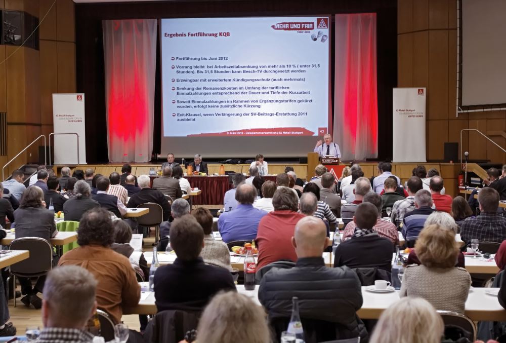 200 Delegierte aus 57 Betrieben sind in der Delegiertenversammlung gewählt worden. Sie wählen den Ortsvorstand, die Geschäftsführung der IG Metall Stuttgart und die Mitglieder der verschiedenen Tarifkommissionen der Metall- und Elektroindustrie, des Handwerks, der TextilBekleidungsindustrie sowie für HolzKunststoffindustrie.