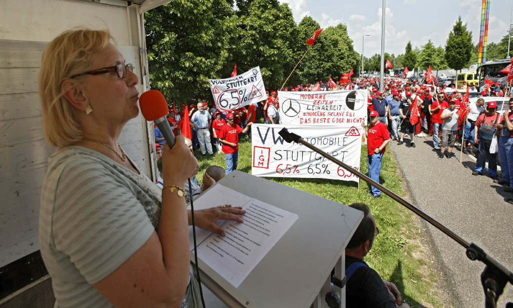 Ilse Kestin von der IG Metall Stuttgart betonte auf der Kundgebung die Wichtigkeit, Regelungen zum Thema Leiharbeit zu finden. BMW plane für die Niederlassungen eine enorme Ausdehnung der Leiharbeit. "Ausscheidende Mitarbeiter werden nur noch durch Leiharbeiter ersetzt, Ausgebildete werden nicht übernommen sondern zu Leiharbeitsfirmen geschickt und dann wieder zurück geleast - Verkäufer nur noch befristet beschäftigt. So gehen entscheidende Kernkompenzen verloren. Deshalb bedarf es auch im Kfz-Handwerk Regelungen zu Leiharbeit."