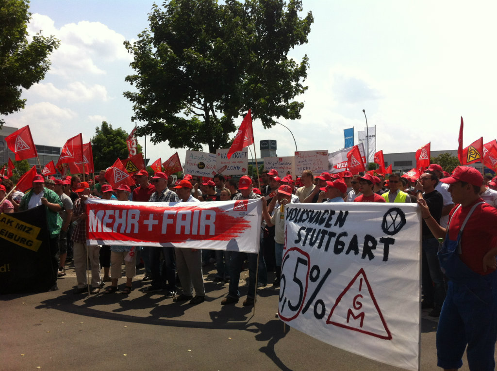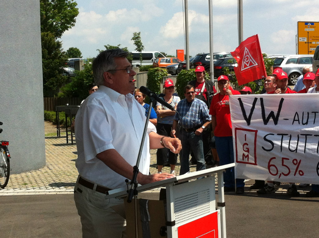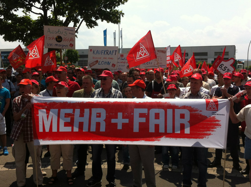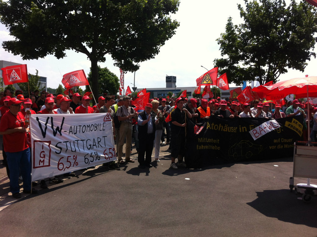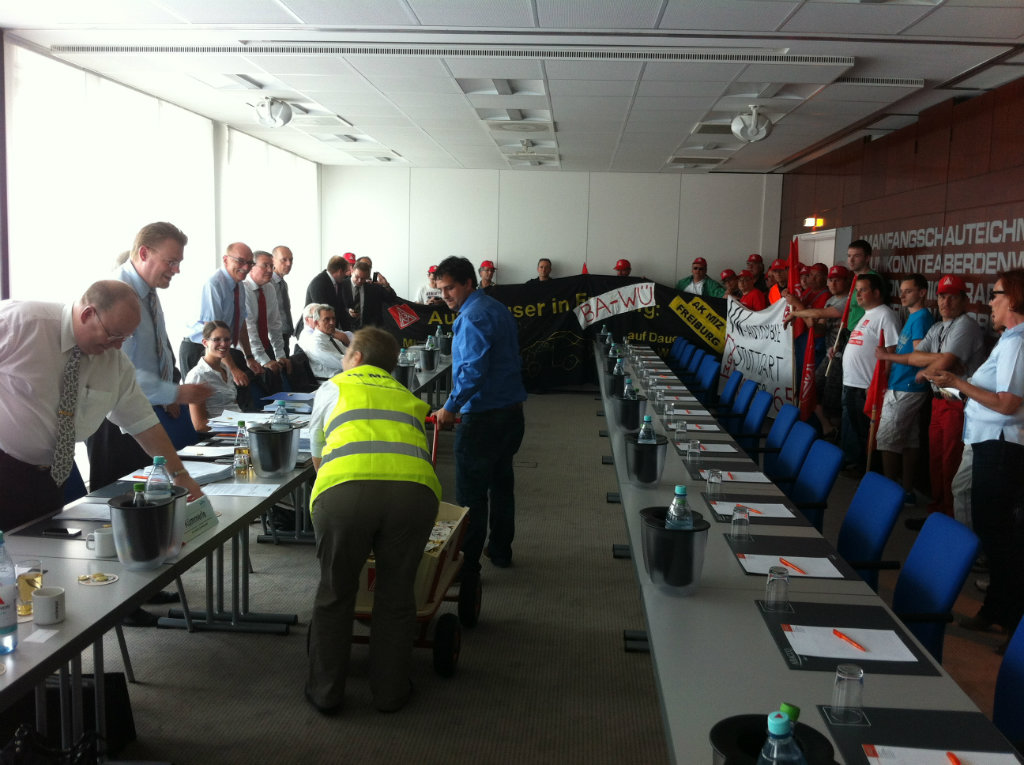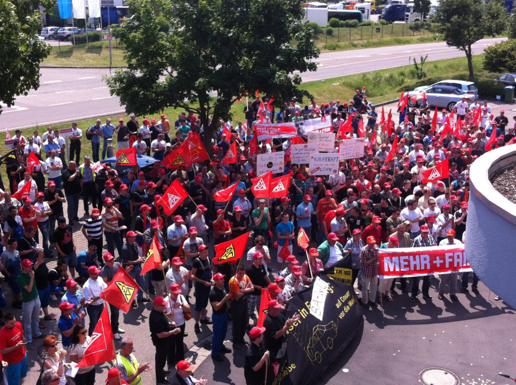 Über 700 Beschäftigte demonstrierten bei der entscheidenden dritten Tarifverhandlung am 30. Mai vor dem Verhandlungslokal in Korntal-Münchingen. Ihr "Besuch" bei der Arbeitgeber-Delegation im Verhandlungszimmer verlieh wohl noch einen letzten Nachdruck für das Tarifergebnis, das am Abend dann errreicht werden konnte.