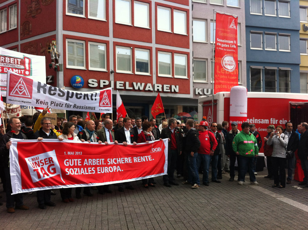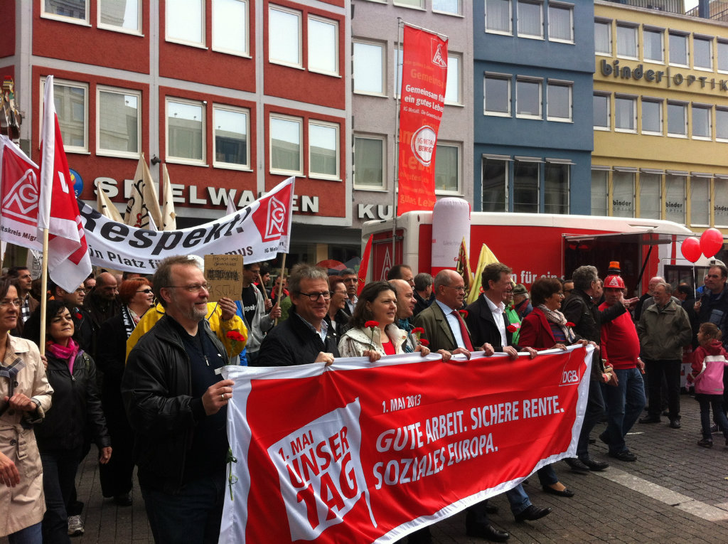 Bundesweit leicht erhöhte Teilnehmerzahlen zum Tag der Arbeit: Am heutigen 1. Mai haben sich 425.000 Menschen an über 439 Veranstaltungen und Kundgebungen des Deutschen Gewerkschaftsbundes beteiligt. Die diesjährigen DGB-Kundgebungen standen unter dem Motto: 1 Mai: Unser Tag - Gute Arbeit, Sichere Rente, Soziales Europa.